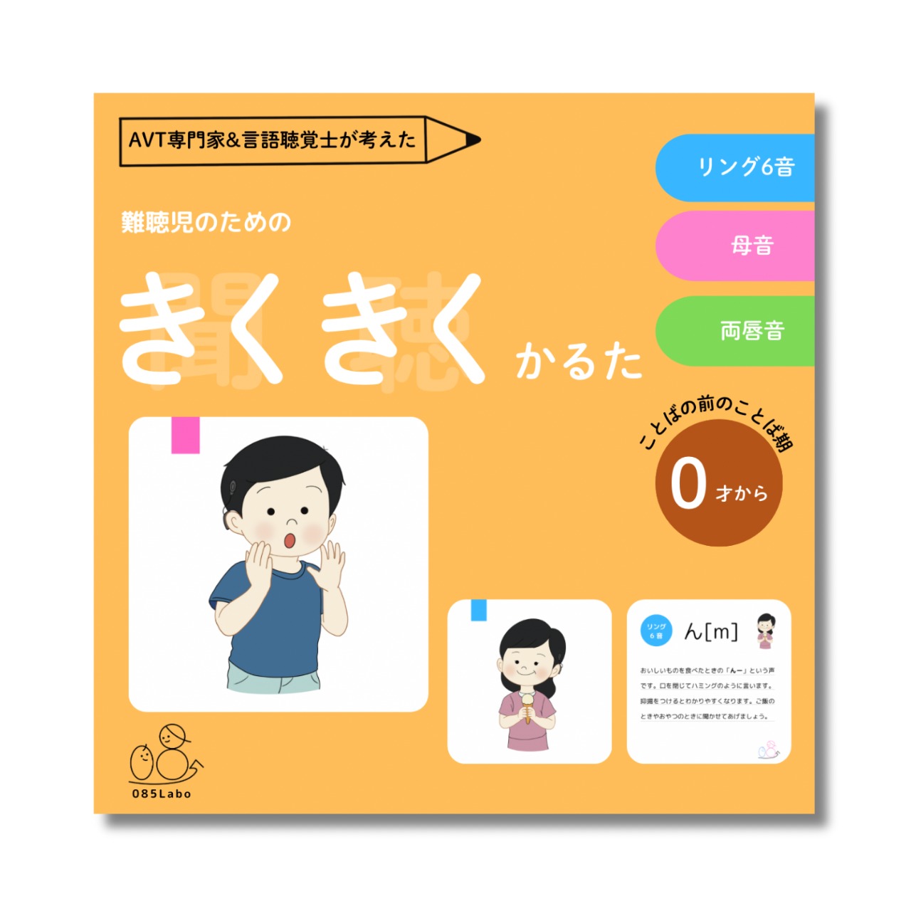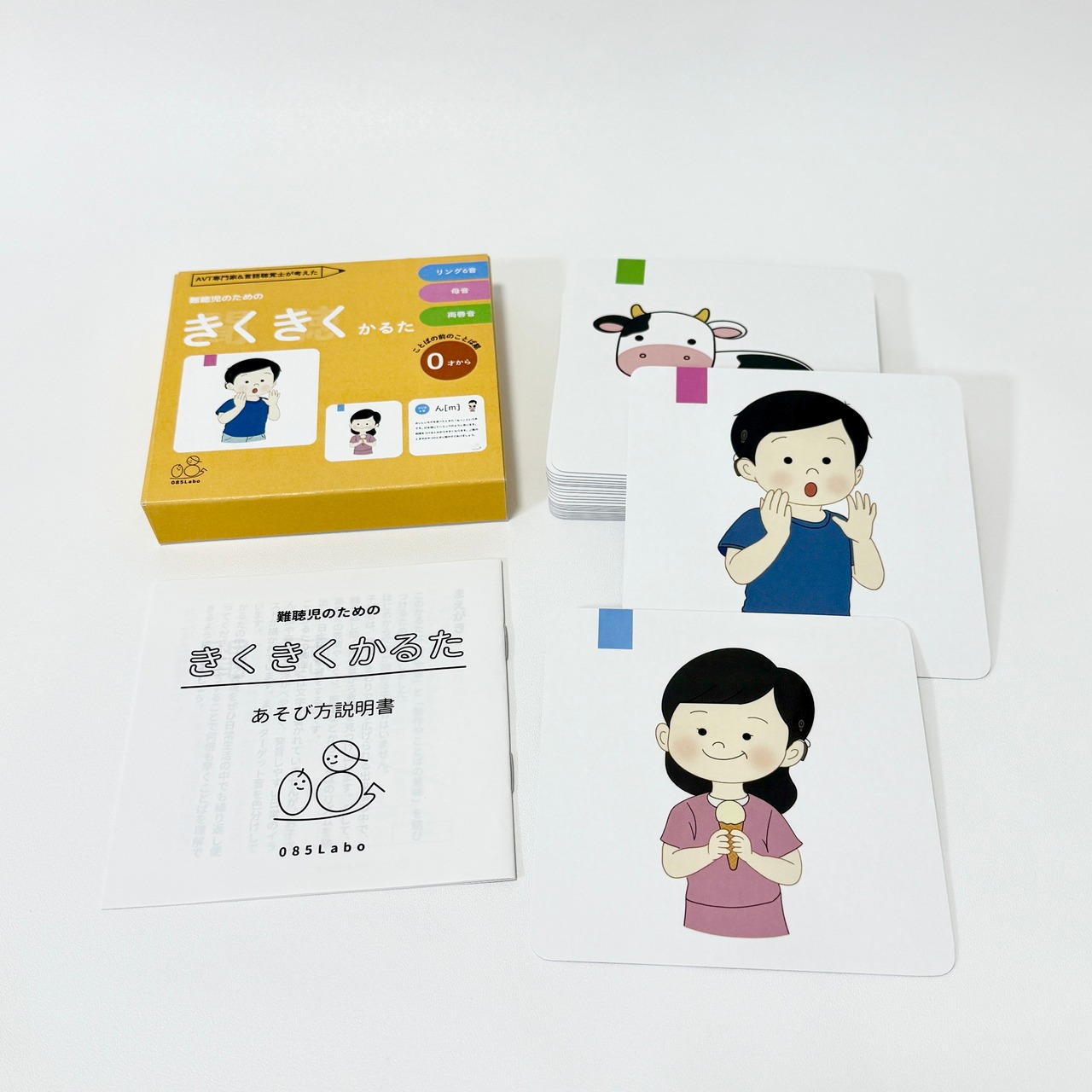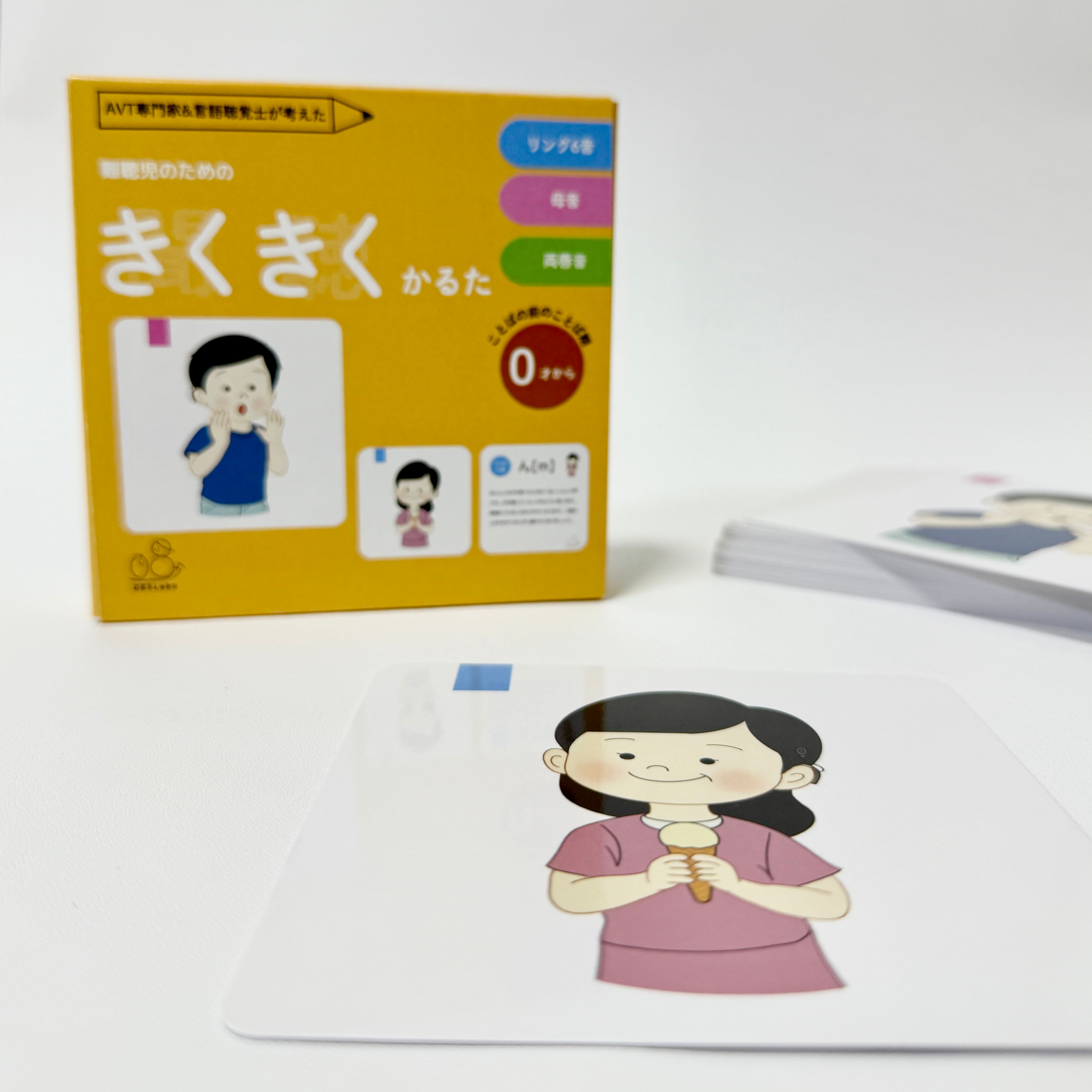 聞こえのチェックに使われる「リング6音」、日本語の基礎となる「母音」、そして子どもが初期に覚える唇を使った音「両唇音」をAVT専門家と言語聴覚士が21音厳選し、楽しく遊べるかるたにしました。