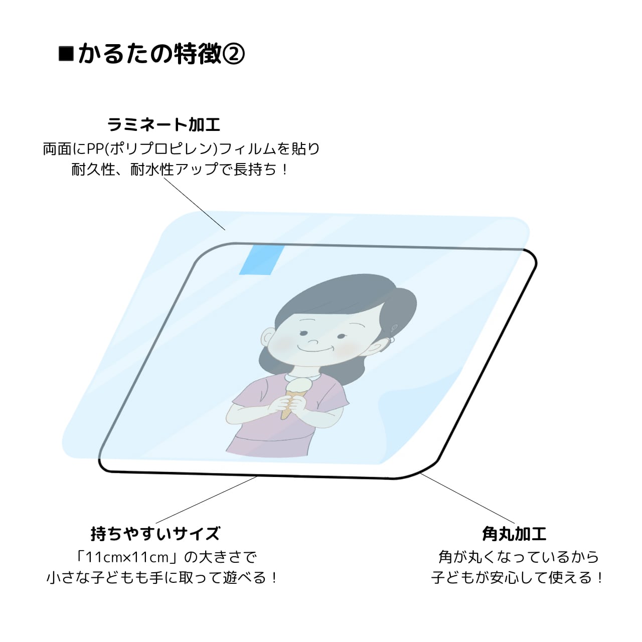 臨床の経験から、折れたり破れたりしにくい厚紙を使用しています。また、口に入れたり落書きしても大丈夫なように両面にPP加工を施しています。さらに小さなお子さんでも見やすく持ちやすい大きさになっています。